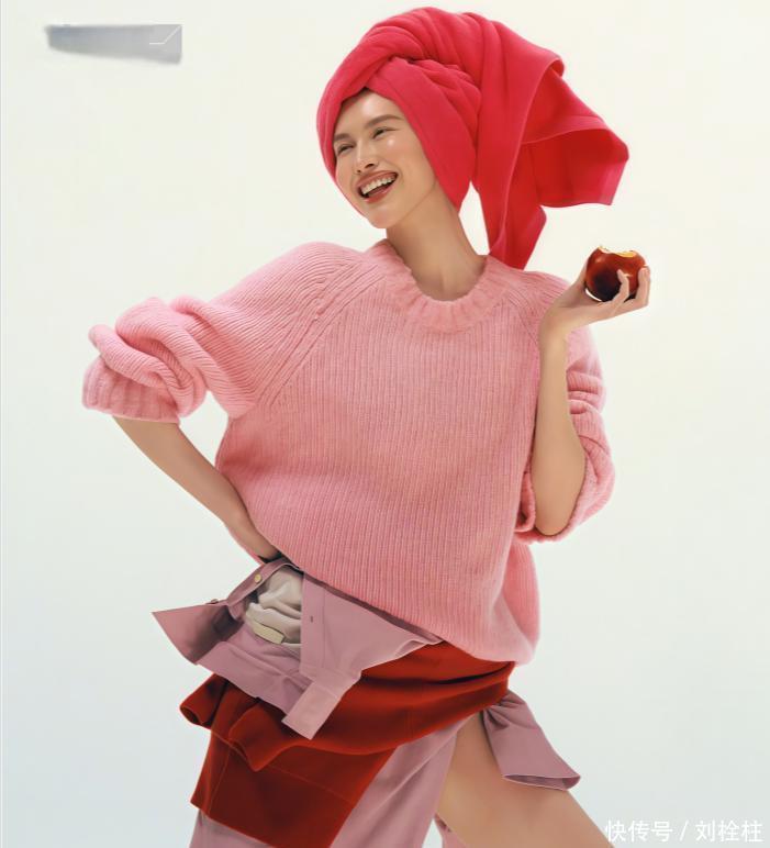 这次拍摄有几套造型特别好看。其中一套她戴了红色的头巾,耳朵上挂着像车厘子一样的红色耳环,手里还拿着一个苹果,整个色彩搭配很大胆但也很有艺术感。